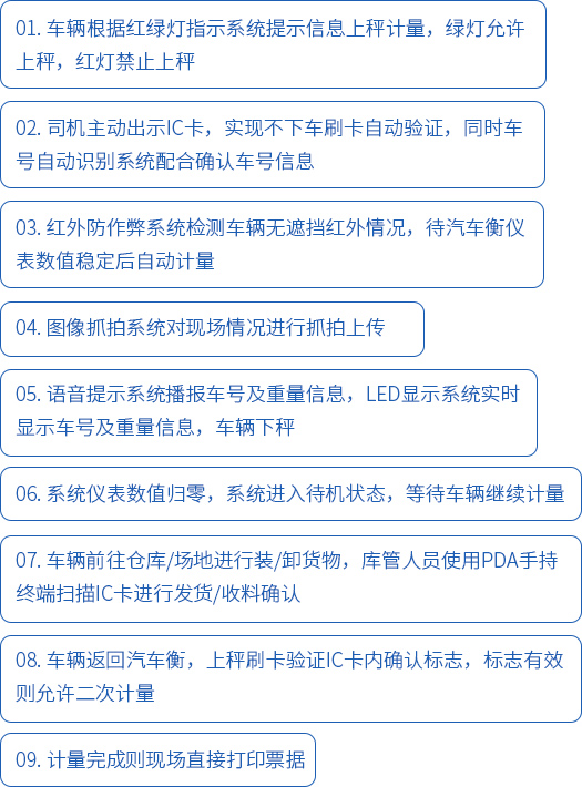 ● 采用先進的紅外光感技術,檢測車輛前輪后輪有無超出衡器范圍、后車是否緊跟壓秤等情況,規范計量流程。